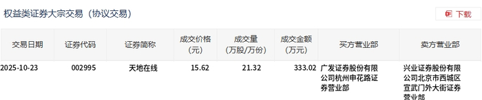 交易概况 - 天地在线于2025年10月23日发生一笔大宗交易,成交量为21.32万股,成交金额为333.02万元 [1] - 该笔大宗交易占公司当日总成交额的8.37% [1] 交易价格分析 - 成交价格为15.62元,较当日市场收盘价17.53元折价10.9% [1] 交易参与方 - 买方营业部为广发证券股份有限公司杭州申花路证券营业部 [2] - 卖方营业部为兴业证券股份有限公司北京市西城区宣武门外大街证券营业部 [2]
