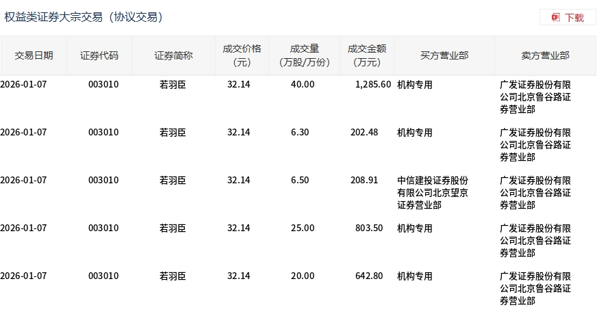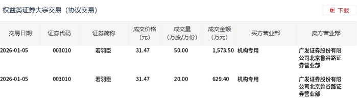 | 交易日期 | 证券代码 | 证券简称 | 成交价格 | 成交量 | 成交金额 | 买方营业部 | 卖方营业部 | | --- | --- | --- | --- | --- | --- | --- | --- | | | | | (元) | (万股/万份) | (万元) | | | | 2026-01-05 | 003010 | 若羽臣 | 31.47 | 50.00 | 1,573.50 机构专用 | | 广发证券股份有限 | | | | | | | | | 公司北京鲁谷路证 | | | | | | | | | 劳营业部 | | 2026-01-05 | 003010 | 若羽臣 | 31.47 | 20.00 | 629.40 机构专用 | | 广发证券股份有限 | | | | | | | | | 公司北京鲁谷路证 | | | | | | | | | 劳营业部 | 1月5日,若羽臣大宗交易成交70万股,成交额2202.9万元,占当日总成交额的10.44%,成交价31.47 元,较市场收盘价35.92元折价12.39%。 ...