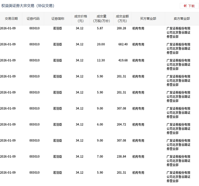 1月9日,若羽臣大宗交易成交86.87万股,成交额2964.01万元,占当日总成交额的9.18%,成交价34.12 元,较市场收盘价38.41元折价11.17%。 | 交易日期 | 证券代码 | 证券简称 | 成交价格 | 成交量 | 成交金额 | 买方营业部 | 卖方营业部 | | --- | --- | --- | --- | --- | --- | --- | --- | | | | | (元) | (万股/万份) | (万元) | | | | 2026-01-09 | 003010 | 若羽臣 | 34.12 | 5.87 | 200.28 | 机构专用 | 广发证券股份有限 | | | | | | | | | 公司北京鲁谷路证 | | | | | | | | | 芽营业部 | | 2026-01-09 | 003010 | 若羽臣 | 34.12 | 20.00 | 682.40 | 机构专用 | 广发证券股份有限 | | | | | | | | | 公司北京鲁谷路证 | | | | | | | | | 券营业部 | | 2026-01-09 | 003010 | 是找臣 | 34.12 | 12. ...