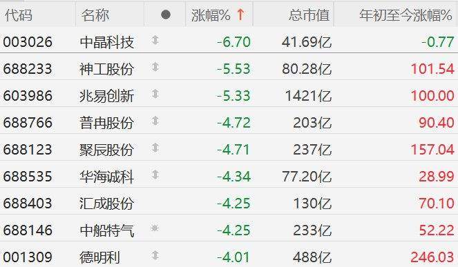 (责任编辑:宋政 HN002) | 代码 | 名称 | 0 | 涨幅%↑ | 总市值 | 年初至今涨幅% | | --- | --- | --- | --- | --- | --- | | 003026 | 中晶科技 | 1 | -6.70 | 41.69亿 | -0.77 | | 688233 | 神工股份 | 1 | -5.53 | 80.28亿 | 101.54 | | 603986 | 兆易创新 | 1 | -5.33 | 1421亿 | 100.00 | | 688766 | 普申股份 $ | | -4.72 | 203亿 | 90.40 | | 688123 | 聚辰股份 | 1 | -4.71 | 237亿 | 157.04 | | 688532 | 华海诚科 | 1 | -4.34 | 77.20亿 | 28.99 | | 688403 | 汇成股份 | | -4.25 | 130亿 | 70.10 | | 688146 | 中船特气 | 兼 | -4.25 | 233亿 | 52.22 | | 001309 | 德明利 | 1 | -4.01 | 488亿 | 246.03 | 格隆汇11月 ...