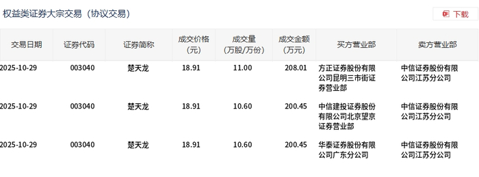 | 交易日期 | 证券代码 | 证券简称 | 成交价格 | 成交量 | 成交舍额 | 买方营业部 | 卖方营业部 | | --- | --- | --- | --- | --- | --- | --- | --- | | | | | (元) | (万股/万份) | (万元) | | | | 2025-10-29 | 003040 | 楚天龙 | 18.91 | 11.00 | 208.01 | 方正证券股份有限 | 中信证券股份有限 | | | | | | | | 公司昆明三中街址 | 公司江苏分公司 | | | | | | | | 券营业部 | | | 2025-10-29 | 003040 | 楚天龙 | 18.91 | 10.60 | 200.45 | 中信建投证券股份 | 中信证券股份有限 | | | | | | | | 有限公司北京里京 | 公司江苏分公司 | | | | | | | | 证券营业部 | | | 2025-10-29 | 003040 | 楚天龙 | 18.91 | 10.60 | 200.45 | 华泰证券股份有限 | 中信证券股份有限 | | | | | | | | 公司广东分公 ...
