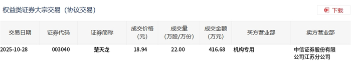 | 权益类证券大宗交易(协议交易) | | | | | | | 团 下载 | | --- | --- | --- | --- | --- | --- | --- | --- | | 交易日期 | 证券代码 | 证券简称 | 成交价格 | 成交量 | 成交金额 | 买方营业部 | 卖方营业部 | | | | | (元) | (万股/万份) | (万元) | | | | 2025-10-28 | 003040 | 楚天龙 | 18.94 | 22.00 | 416.68 | 机构专用 | 中信证券股份有限 公司江苏分公司 | 10月28日,楚天龙大宗交易成交22万股,成交额416.68万元,占当日总成交额的1.23%,成交价18.94 元,较市场收盘价21.01元折价9.85%。 ...
