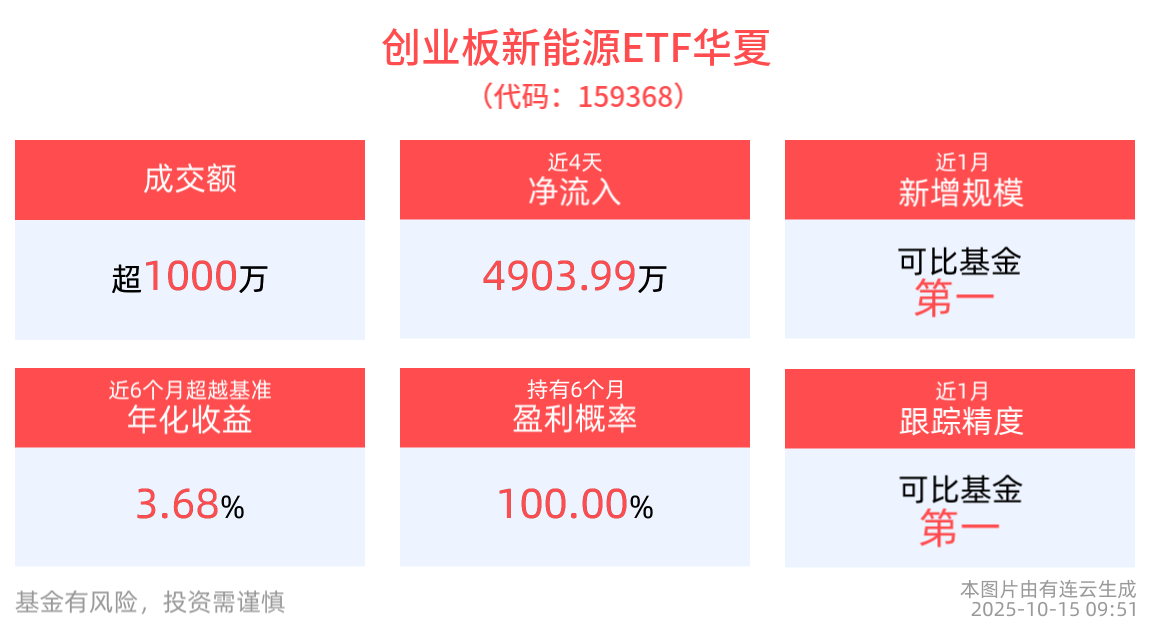 截至10月14日,创业板新能源ETF华夏近6月净值上涨64.88%,指数股票型基金排名90/3739,居于前2.41%。从收益能力看,截至2025年10月14日,创业板 新能源ETF华夏自成立以来,最高单月回报为29.70%,最长连涨月数为5个月,最长连涨涨幅为75.89%,涨跌月数比为5/1,上涨月份平均收益率为12.56%, 月盈利百分比为83.33%,月盈利概率为77.87%,历史持有6个月盈利概率为100.00%。截至2025年10月14日,创业板新能源ETF华夏近6个月超越基准年化收 益为3.68%。 回撤方面,截至2025年10月14日,创业板新能源ETF华夏近半年相对基准回撤0.31%。 费率方面,创业板新能源ETF华夏管理费率为0.15%,托管费率为0.05%,费率在可比基金中最低。 跟踪精度方面,截至2025年10月14日,创业板新能源ETF华夏近1月跟踪误差为0.010%,在可比基金中跟踪精度最高。 截至2025年10月15日 09:51,创业板新能源ETF华夏(159368)下跌1.27%,最新报价1.4元。拉长时间看,截至2025年10月14日,创业板新能源ETF华夏近1月 累计上涨4 ...