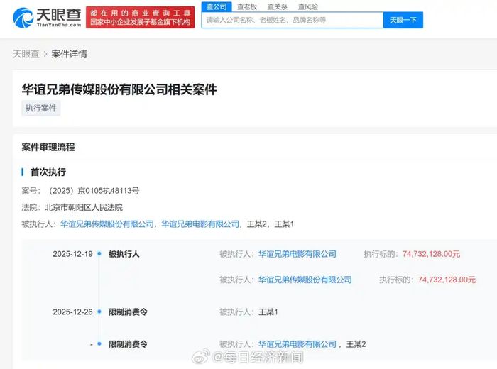 每经编辑|黄胜 近日,中国影视巨头华谊兄弟及其创始人深陷法律与财务漩涡。 据天眼查官网显示,近日华谊兄弟旗下两家核心公司华谊兄弟电影有限公司、华谊兄弟传媒股份有限公司及其法定代表人王忠磊、王忠军被北京市朝阳区人 民法院限制高消费,涉及7473万元执行案件。 | 都在用的商业查询工具 | 童公司 | 查老板 查关系 查风险 | | | | | | | | --- | --- | --- | --- | --- | --- | --- | --- | --- | | 请输入公司名称、老板姓名、品牌名称等 国家中小企业发展子基金旗下机构 | | | | 天眼一下 | | | | | | 天眼查 > 案件详情 | | | | | | | | | | 华谊兄弟传媒股份有限公司相关案件 | | | | | | | | | | 执行案件 | | | | | | | | | | 案件审理流程 | | | | | | | | | | 首次执行 | | | | | | | | | | 案号:(2025) 京0105执48113号 | | | | | | | | | | 法院:北京市朝阳区人民法院 | | | | | | | | ...