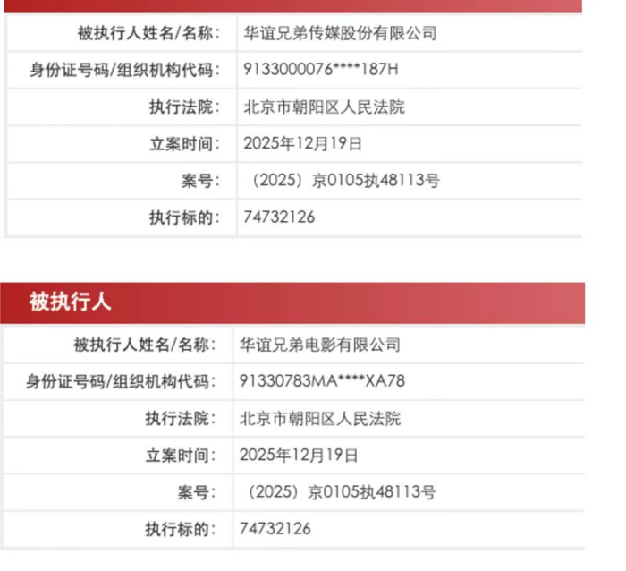 图自中国执行信息公开网 公开资料显示,华谊兄弟传媒股份有限公司由王忠军、王忠磊兄弟在1994年创立。上世纪90年代曾参与投资冯小刚执导的《没完没了》等知名影片。在依靠 贺岁片打出名声后,华谊兄弟开始在电影电视、艺人经纪、音乐唱片、娱乐营销等领域发力,并于2009年上市。2015年,华谊兄弟净利润达到了12.18亿 元,创下了净利润的最高值。但好景不长,进入2018年,华谊兄弟的业绩出现大幅下跌。 到今年,华谊兄弟三季报显示,2025年前三季度归属于上市公司股东的净利润为-1.14亿元,较上年同期下降168.15%,归属于上市公司股东的扣除非经常性 损益的净利润为-1.63亿元,较上年同期下降255.75%。目前,华谊兄弟市值不足60亿元,与2015年巅峰时近900亿元的总市值相比,跌幅超9成。 国家企业信用信息公示系统显示,华谊兄弟传媒股份有限公司成立于2004年11月,注册资本277450.5919万人民币,法定代表人为王忠军。华谊兄弟电影有 限公司成立于2015年12月,注册资本10000万人民币,法定代表人为王忠磊,由华谊兄弟传媒股份有限公司全资持股。 中新网12月24日电(吴家驹)中国执行信息公开网显 ...