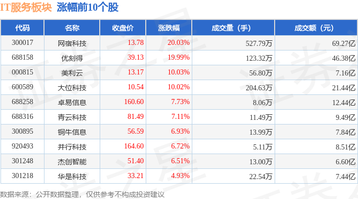 证券之星消息,1月26日IT服务板块较上一交易日下跌1.88%,ST赛为领跌。当日上证指数报收于 4132.61,下跌0.09%。深证成指报收于14316.64,下跌0.85%。IT服务板块个股涨跌见下表: | 代码 | 名称 | 收盘价 | 涨跌幅 | 成交量(手) | 成交额(元) | | | --- | --- | --- | --- | --- | --- | --- | | 300017 | 网宿科技 | 13.78 | 20.03% | 527.79万 | | 69.27 亿 | | 688158 | 优刻得 | 39.13 | 19.99% | 123.32万 | | 46.38亿 | | 000815 | 美利云 | 13.17 | 10.03% | 56.80万 | | 7.16亿 | | 600589 | 大位科技 | 10.54 | 10.02% | 204.63万 | | 21.44亿 | | 688258 | 卓易信息 | 160.60 | 7.73% | 8.06万 | | 12.44亿 | | 688316 | 青云科技 | 81.49 | 7.11% | 11.49万 | | ...