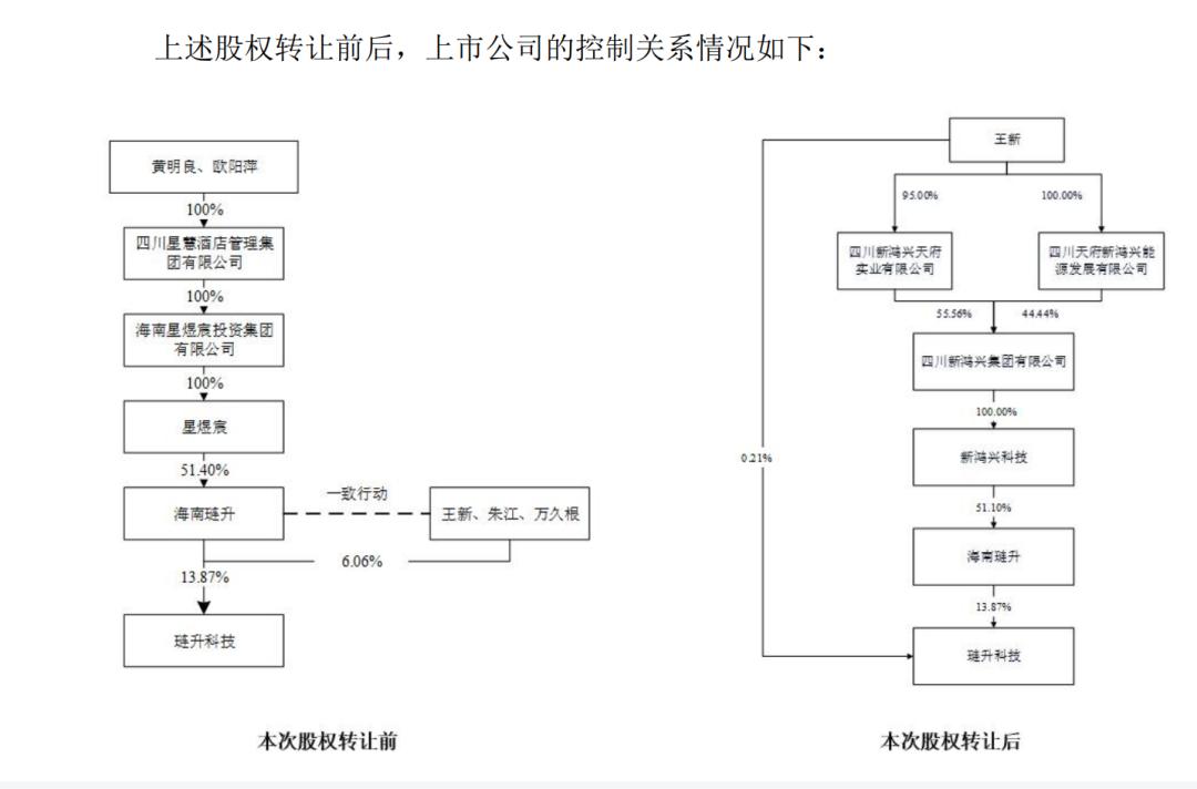 本次股权转让完成后,新鸿兴科技将成为海南琏升的控股股东,新鸿兴科技的实际控制人为王新。2025 年12月15日,黄明良、朱江、黄玉洁辞去海南琏升董事职务;万久根与海南琏升签署《解约协议》,约 定其与海南琏升之间表决权委托终止。本次海南琏升股权结构调整及董事会改选完成后,海南琏升控股 股东由星煜宸变更为新鸿兴科技,实际控制人由黄明良、欧阳萍变更为王新。上市公司控股股东仍为海 南琏升,由于万久根、朱江不再为海南琏升一致行动人,且万久根与海南琏升解除《表决权委托协 议》,海南琏升及其一致行动人拥有的上市公司权益比例从19.93%变为14.08%。 本次权益变动不触及要约收购,不存在违反《上市公司收购管理办法》《上市公司股东减持股份管理暂 行办法》等有关法律、法规、部门规章及规范性文件和《公司章程》相关规定的情形。本次权益变动 后,公司控股股东仍为海南琏升,公司实际控制人将由黄明良、欧阳萍变更为王新。 格隆汇12月15日丨琏升科技(300051.SZ)公布,公司控股股东海南琏升科技有限公司(简称"海南琏升") 股东海南星煜宸科技有限公司(简称"星煜宸")、四川天府新鸿兴科技有限公司(简称"新鸿兴科 技")、福建水华星 ...