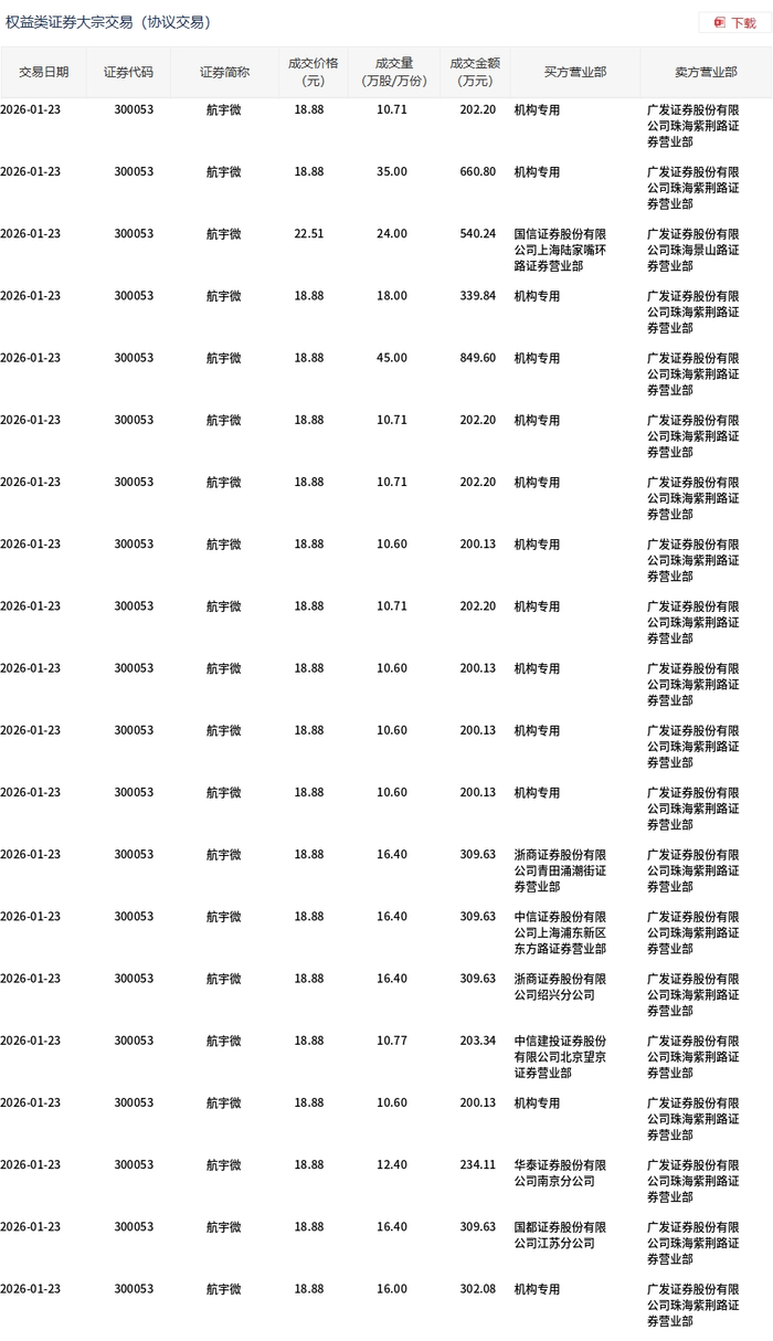 大宗交易概况 - 2026年1月23日,航宇微(300053)发生大宗交易,总成交414万股,总成交额7903.42万元,占当日总成交额的2.1% [1] - 成交均价为19.09元,较市场收盘价22.96元折价16.85% [1] - 交易价格区间为18.88元至22.51元 [1] 交易明细分析 - 当日共发生多笔大宗交易,绝大多数成交价格为18.88元 [2] - 买方以“机构专用”席位为主,共涉及多笔交易,例如:以18.88元成交10.71万股(202.20万元)、35.00万股(660.80万元)、18.00万股(339.84万元)、45.00万股(849.60万元)等 [2] - 其他买方包括国信证券上海陆家嘴环路营业部(以22.51元成交24.00万股,540.24万元)、浙商证券、中信证券、中信建投证券、华泰证券、国都证券等营业部或分公司 [2][3] - 卖方营业部高度集中,主要来自广发证券位于珠海的多家营业部,包括繁荆路、景山路、雾荆路、紫荆路等 [2][3]
