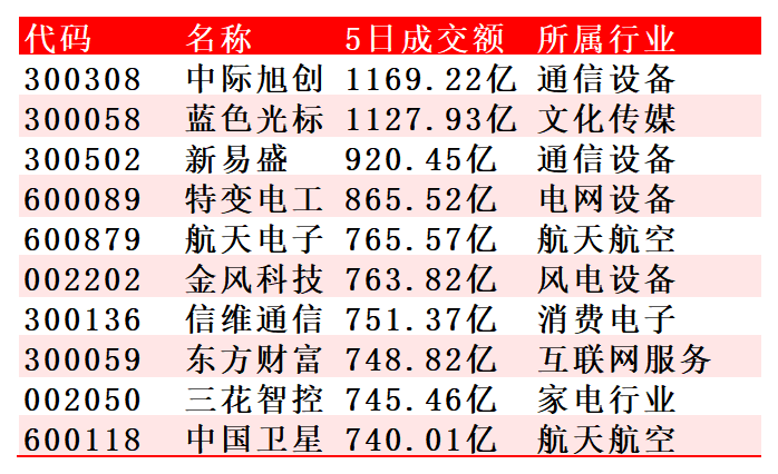 转自:新华财经 | 代码 | 名称 5日成交额 所属行业 | | --- | --- | | 300308 | 中际旭创 1169.22亿 通信设备 | | 300058 | 蓝色光标 1127.93亿 文化传媒 | | 300502 | 新易盛 920.45亿 通信设备 | | 600089 | 特変电工 865.52亿 电网设备 | | 600879 | 航天电子 765.57亿 航天航空 | | 002202 | 金风科技 763.82亿 风电设备 | | 300136 | 信维通信 751.37亿 消费电子 | | 300059 | 东方财富 748.82亿 互联网服务 | | 002050 | 三花智控 745.46亿 家电行业 | | 600118 | 中国卫星 740.01亿 航天航空 | 周成交额前十位个股 编辑:李一帆 本 新华财经上海1月16日电(林郑宏)本周A股市场交投活跃,据新华财经统计,全周沪深两市成交额突 破17万亿元大关,达17.1万亿元,创历史单周最高成交纪录。同时,本周日平均成交额约3.42万亿元, 也是历史上首次出现单周日平均成交额突破3万亿元。 此前的市场单周最高成交纪录 ...