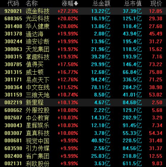 据媒体报道称,马斯克当地时间1月10日在社交媒体平台X发文称,将在一周内正式开源X平台最新的 内容推荐算法,覆盖"所有用于决定向用户推荐自然内容和广告内容的代码"。马斯克表示,"此过程将 每四周重复一次",同时附带开发者说明,标注算法和逻辑上的改动内容。 编辑丨瑜见 | 代码 | 名称 | 米帽 | 息金额 | 息市值 | 现价 | | --- | --- | --- | --- | --- | --- | | 920021 | 流金科技 | +27.23% | 13.22 乙 | 37.39 Z | 12.02 | | 288362 | 光云科技 | +20.02% | 16.19 乙 | 125.1 乙 | 29.38 | | 301408 | 华人健康 | +20.00% | 13.06 Z | 110.4亿 | 27.60 | | 301378 | 通达海 | +19.99% | 2.08 Z | 43.94 乙 | 45.49 | | 300244 | 迪安诊断 | +19.99% | 13.96 Z | 195.4 乙 | 31.27 | | 300063 | 天龙集团 | +19.97% | 2 ...