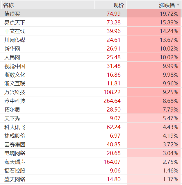 本报记者 陈红 1月13日,传媒(申万)板块延续强势走势,截至中午收盘,板块指数报1033.55点,单日涨幅达 3.42%,个股普涨态势显著。天龙集团(300063)(300063)、人民网(603000)、新华网(603888) (603888)、引力传媒(603598)(603598)等均涨停。其中,引力传媒7个交易日内录得6个涨停。 政策层面的"规范+扶持"双轨导向,也为传媒行业发展筑牢基础。1月8日,国家广播电视总局网络视听 司发布《管理提示(儿童类微短剧)》,明确遏制儿童类微短剧"成人化""工具化"倾向;1月4日,广东 省发布《关于以高水平开放推动数字贸易和服务贸易高质量发展的实施意见》,叠加国家"文化出海"战 略推进,为传媒企业数字内容出海打开增量空间。 盘古智库(北京)信息咨询有限公司高级研究员余丰慧对《证券日报》记者分析称:"政策的双向调控 正重塑传媒行业的竞争格局。监管端通过设置行业门槛、规范内容创作,加速淘汰微短剧等领域的劣质 产能,推动资源向具备合规能力与内容创作实力的头部企业集中;扶持端的文化出海政策,则为传媒企 业提供了海外市场的增量空间,尤其是AI赋能后的网文、短剧等数字内容,在海 ...