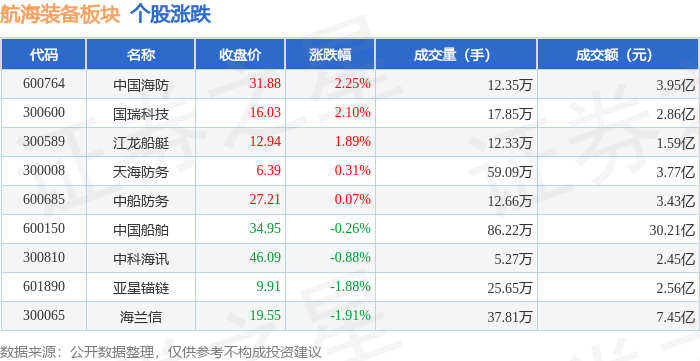 证券之星消息,10月9日航海装备板块较上一交易日上涨1.13%,海兰信领涨。当日上证指数报收于 3933.97,上涨1.32%。深证成指报收于13725.56,上涨1.47%。航海装备板块个股涨跌见下表: | 代码 | 名称 | 收盘价 | 涨跌幅 | 成交量(手) | 成交额(元) | | --- | --- | --- | --- | --- | --- | | 300065 | 海兰信 | 19.93 | 6.01% | 65.96万 | 12.96亿 | | 300589 | 江龙船艇 | 12.70 | 2.09% | 9.54万 | · 1.21亿 | | 300008 | 天海防务 | 6.37 | 1.43% | 55.95万 | 3.55亿 | | 600150 | 中国船舶 | 35.04 | 1.27% | 103.12万 | 35.85 Z | | 300600 | 園瑞科技 | 15.70 | 0.51% | 9.86万 | 1.53亿 | | 300810 | 武夷君 | 46.50 | -0.17% | 4.22万 | 1.95亿 | | 600764 | 中国海防 | 31.1 ...