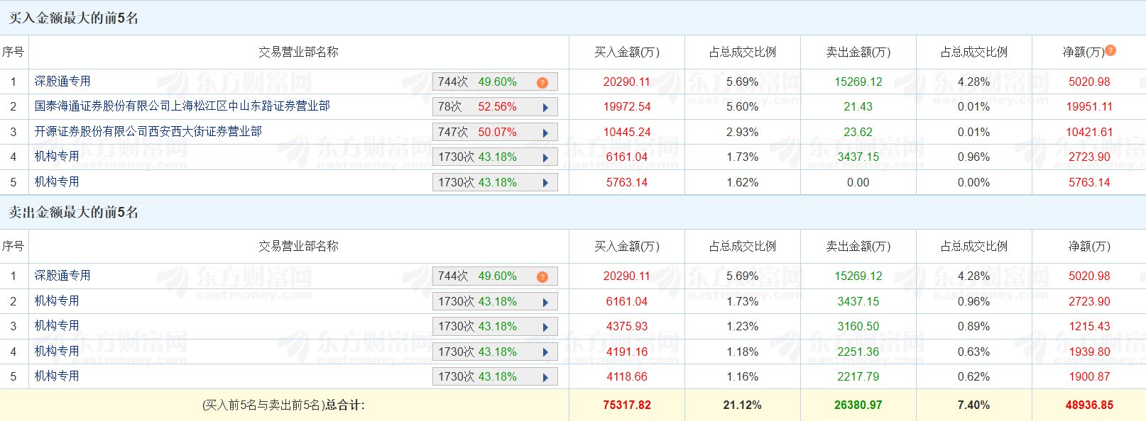 | 序号 | 交易营业部名称 | | 买入金额(万) | 占总成交比例 | | --- | --- | --- | --- | --- | | | 深股通专用 | 744次 49.60% 2 | 20290.11 | 5.69% | | 2 | 国泰海通证券股份有限公司上海松江区中山东路证券营业部 | 78次 52.56% ▲ | 19972.54 | 5.60% | | 3 | 开源证券股份有限公司西安西大街证券营业部 | 747次 50.07% | 10445.24 | 2.93% | | ব | 机构专用 | 1730次 43.18% A | 6161.04 | 1.73% | | 5 | 机构专用 | 1730次 43.18% ▲ | 5763.14 | 1.62% | | 序号 | | 交易营业部名称 | | | 买入金额(万) | 占总成交比例 | | --- | --- | --- | --- | --- | --- | --- | | | 深股通专用 | | 744次 49.60% | 0 | 20290.11 | 5.69% | | 2 | 机构专用 | eastmoney.com | 17 ...