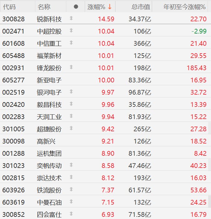 机器人概念股市场表现 - 1月22日A股机器人概念股整体走强,多只个股出现大幅上涨[1] - 锐新科技涨幅领先,达到14.59%[1][2] - 中超控股、中信重工、福莱新材、锋龙股份、新亚电子、银河电子、毅昌科技、天润工业共8只股票涨停,涨幅均超过9.94%[1][2] - 超捷股份、高新兴涨幅超过9%,运机集团、奕帆传动、崇达技术涨幅超过8%[1][2] 领涨个股详情 - 锐新科技总市值34.37亿元,年初至今涨幅22.70%[2] - 锋龙股份年初至今涨幅高达185.43%,总市值198亿元[2] - 奕帆传动年初至今涨幅40.23%,总市值47.46亿元[2] - 铁流股份年初至今涨幅53.66%,总市值61.57亿元[2] - 银河电子年初至今涨幅32.72%,总市值96.87亿元[2] - 福莱新材年初至今涨幅29.55%,总市值125亿元[2] - 超捷股份年初至今涨幅27.28%,总市值265亿元[2] - 中曼石油年初至今涨幅24.25%,总市值132亿元[2] - 中信重工总市值366亿元,年初至今涨幅21.40%[2] - 高新兴总市值126亿元,年初至今涨幅18.52%[2] - 四会富仕总市值71.58亿元,年初至今涨幅16.79%[2] - 新亚电子总市值83.36亿元,年初至今涨幅16.95%[2] - 崇达技术总市值193亿元,年初至今涨幅16.03%[2] - 天润工业总市值81.93亿元,年初至今涨幅15.22%[2] - 毅昌科技总市值35.86亿元,年初至今涨幅13.39%[2] - 运机集团总市值81.36亿元,年初至今涨幅8.42%[2] - 中超控股总市值106亿元,年初至今跌幅2.99%[2]
