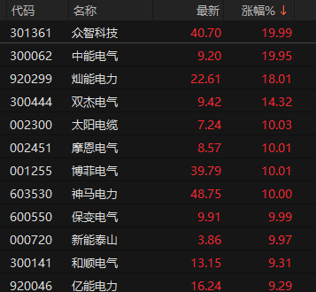 | 代码 | 名称 | | 涨幅% ↑ | | --- | --- | --- | --- | | 301361 | 众智科技 | 40.70 | 19.99 | | 300062 | 中能电气 | 9.20 | 19.95 | | 920299 | 灿能电力 | 22.61 | 18.01 | | 300444 | 双杰电气 | 9.42 | 14.32 | | 002300 | 太阳电缆 | 7.24 | 10.03 | | 002451 | 摩恩电气 | 8.57 | 10.01 | | 001255 | 博菲电气 | 39.79 | 10.01 | | 603530 | 神马电力 | 48.75 | 10.00 | | 600550 | 保变电气 | 9.91 | 9.99 | | 000720 | 新能泰山 | 3.86 | 9.97 | | 300141 | 和顺电气 | 13.15 | 9.31 | | 920046 | 亿能电力 | 16.24 | 9.29 | 来源:上海证券报·中国证券网 上证报中国证券网讯 11月5日早盘,电网设备板块拉升,截至10时34分,众智科技、中能电气20cm涨 ...
