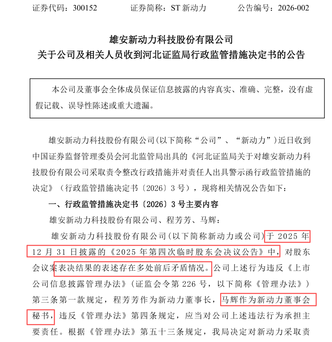 股东会公告前后表述“打架”!ST新动力被责令改正