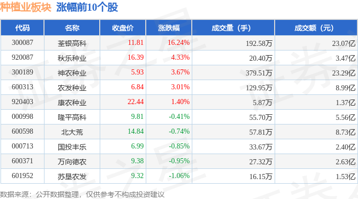 从资金流向上来看,当日种植业板块主力资金净流入1.58亿元,游资资金净流入1.09亿元,散户资金净流 出2.67亿元。种植业板块个股资金流向见下表: 证券之星消息,11月21日种植业板块较上一交易日下跌0.74%,宏辉果蔬领跌。当日上证指数报收于 3834.89,下跌2.45%。深证成指报收于12538.07,下跌3.41%。种植业板块个股涨跌见下表: | 代码 | 名称 | 收盘价 | 涨跌幅 | 成交量(手) | 成交额(元) | | | --- | --- | --- | --- | --- | --- | --- | | 300087 | 茎银高科 | 11.81 | 16.24% | 192.58万 | | 23.07亿 | | 920087 | 秋乐种业 | 16.39 | 4.33% | 20.40万 | | 3.47亿 | | 300189 | 神农种业 | 5.93 | 3.67% | 379.51万 | | 23.29亿 | | 600313 | 农发种业 | 6.84 | 3.01% | 129.95万 | | 2666.8 | | 920403 | 康农种业 | 22.44 | 1.4 ...