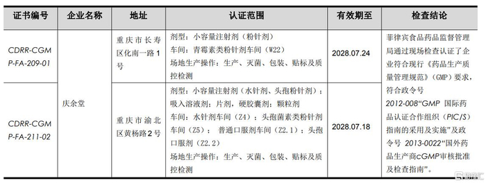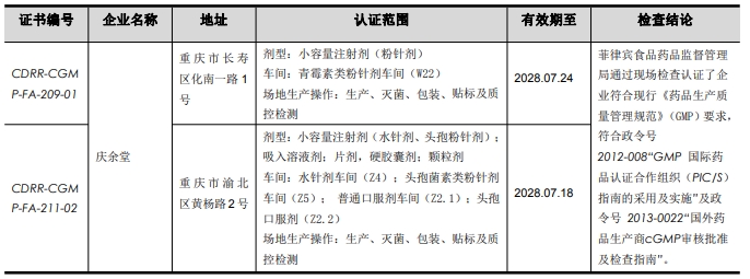 公司GMP认证进展 - 全资子公司庆余堂近日获得菲律宾共和国卫生部食品药品监督管理局签发的《GMP符合性证书》[1] - 认证表明相关制剂生产质量管理体系符合菲律宾的GMP要求[1] - 此次认证预计将对子公司相关产品的海外市场拓展带来积极影响[1] 认证具体信息 - 认证涉及两个证书编号,分别为CDRR-CGM P-FA-209-01和CDRR-CGM P-FA-211-02[2] - 认证覆盖重庆市长寿区化南一路1号和重庆市渝北区黄杨路2号两个生产地址[2] - 认证有效期分别至2028年7月24日和2028年7月18日[2] 认证范围与生产操作 - 认证范围包括小容量注射剂(粉针剂、水针剂、头孢粉针剂)、吸入溶液剂、片剂、硬胶囊剂、颗粒剂等多种剂型[2] - 覆盖青霉素类粉针剂车间(W22)、水针剂车间(Z4)、头孢菌素类粉针剂车间(25)、普通口服剂车间(Z2.1)、头孢口服剂车间(Z2.2)等多个生产车间[2] - 认证的生产操作包括生产、灭菌、包装、贴标及质控检测等完整流程[2] 认证标准与依据 - 认证结论依据菲律宾政令号2012-008"GMP国际药指南的采用及实施"和政令号2013-0022"国外药品生产商cGMP审核批准及检查指南"[2] - 认证符合药品认证合作组织(PIC/S)的《药品生产质量管理规范》(GMP)要求[2]