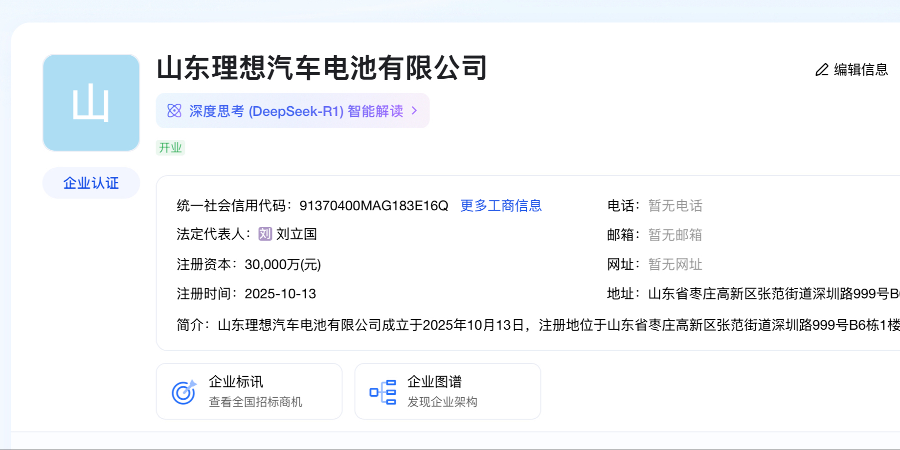 山东理想汽车电池有限公司成立,注册资本3亿元