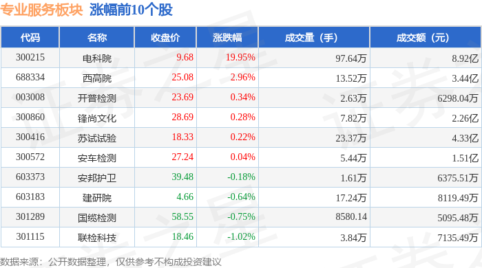 市场整体表现 - 2024年2月2日,上证指数报收于4015.75点,下跌2.48%,深证成指报收于13824.35点,下跌2.69% [1] - 当日专业服务板块整体下跌1.7%,表现弱于大盘 [1] 板块个股涨跌情况 - 板块内涨幅最大的个股为电科院,收盘价9.68元,涨幅达19.95%,成交额8.92亿元 [1] - 西高院上涨2.96%,收于25.08元,成交额3.44亿元 [1] - 开普检测、锋尚文化、苏试试验、安车检测微幅上涨,涨幅分别为0.34%、0.28%、0.22%、0.04% [1] - 板块领跌个股为中钢天源,收盘价10.32元,跌幅达4.88%,成交额2.21亿元 [2] - 胜科纳米下跌4.70%,兰生股份下跌4.36%,科锐国际下跌4.00%,国义招标下跌3.75%,中纺标下跌3.73% [2] 板块资金流向 - 当日专业服务板块整体主力资金净流入2.33亿元,但游资资金净流出7652.44万元,散户资金净流出1.57亿元 [2] - 电科院获得主力资金大幅净流入2.58亿元,主力净流入占比高达28.96%,但同时游资净流出1.11亿元,散户净流出1.48亿元 [3] - 西高院主力资金净流入3672.26万元,占比10.68% [3] - 信测标准主力资金净流入3306.43万元,占比7.13%,游资净流入2772.96万元,占比5.98% [3] - 苏试试验主力资金净流入2029.91万元,占比4.69%,游资净流入1799.27万,占比4.16% [3]