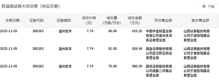 大宗交易概况 - 2025年11月5日,温州宏丰发生大宗交易,总成交量236万股,总成交额1826.64万元,占当日总成交额的5.13% [1] - 成交价格为7.74元,较市场收盘价7.9元折价2.03% [1] 交易明细分析 - 当日共发生三笔大宗交易,成交价格均为7.74元 [2] - 三笔交易成交量分别为80万股、81万股和75万股,对应成交额分别为619.20万元、626.94万元和580.50万元 [2] - 卖方营业部均为山西证券股份有限公司宁波地区的营业部 [2] - 买方营业部分别为中国中金财富证券泉州丰泽街营业部、国金证券武汉积玉桥营业部和国信证券成都二环路营业部 [2]