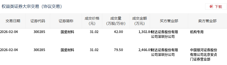 大宗交易概况 - 2026年2月4日,国瓷材料发生大宗交易,总成交121.5万股,总成交额3768.93万元,占该股当日总成交额的4.4% [1] - 大宗交易成交价为31.02元,与当日市场收盘价持平 [1] 交易明细分析 - 当日共发生两笔大宗交易,买方营业部均为财达证券股份有限公司深圳分公司 [2] - 第一笔成交42.00万股,成交额1302.84万元,卖方为机构专用席位 [2] - 第二笔成交79.50万股,成交额2466.09万元,卖方为中国银河证券股份有限公司北京安贞门证券营业部 [2]