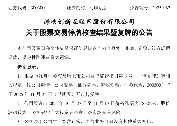 海峡创新(300300)11月20日晚间公告,此前,公司就股票交易波动情况进行了停牌核查。鉴于相关自 查工作已完成,根据《深圳证券交易所上市公司自律监管指引第6号——停复牌》等相关规定,经公司 申请,公司股票(证券简称:海峡创新,证券代码:300300)将于2025年11月21日(星期五)开市起复 牌。 核查完成了。 经查:1.公司前期披露的信息不存在需要更正、补充之处;2.公司未发现近期公共传媒报道了可能或已 经对公司股票交易价格产生较大影响的未公开重大信息;3.公司目前经营情况正常,内外部经营环境未 发生重大变化;4.经核查,公司、控股股东及实际控制人不存在关于公司的应披露而未披露的重大事 项,或处于筹划阶段的重大事项;5.经核查,公司控股股东及实际控制人在股票异常波动期间不存在买 卖公司股票的情形。 海峡创新指出,公司股价自2025年10月27日至11月17日价格涨幅为185.89%,其间于2025年10月28日、 11月4日、11月17日出现三次股价异常波动或严重异常波动,严重背离公司基本面。同时,截至2025年 11月19日,根据中证指数有限公司的最新数据,公司静态市盈率为2141.42倍,滚动市盈 ...