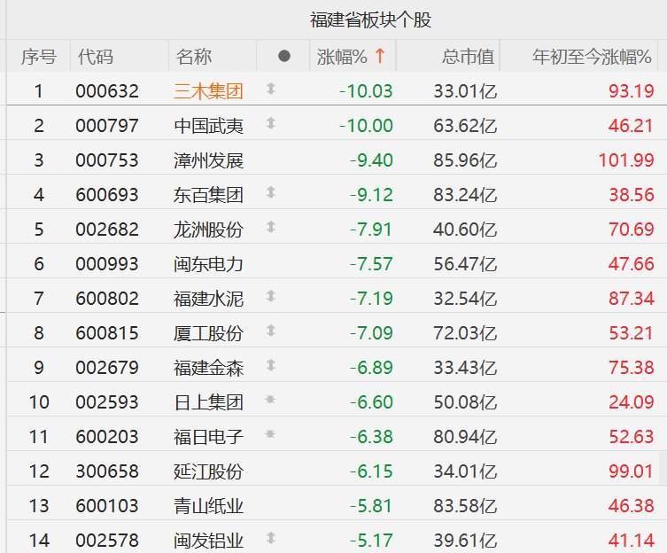 | | | | | 福建省板块个股 | | | | --- | --- | --- | --- | --- | --- | --- | | 序号 代码 | | 名称 | 9 | 涨幅%↑ | 总市值 | 年初至今涨幅%。 | | 1 | 000632 | 三木集团 | 1 | -10.03 | 33.01亿 | 93.19 | | 2 | 000797 | 中国武夷 | | $ -10.00 | 63.62 Z | 46.21 | | 3 | 000753 | 漳州发展 | | -9.40 | 85.96亿 | 101.99 | | 4 | 600693 | 东百集团 | 1 | -9.12 | 83.24亿 | 38.56 | | ഗ | 002682 | 龙洲股份 | 1 | -7.91 | 40.60亿 | 70.69 | | 6 | 000993 | 闽东电力 | | -7.57 | 56.47 亿 | 47.66 | | 7 | 600802 | 福建水泥 | 1 | -7.19 | 32.54Z | 87.34 | | 8 | 600815 | 厦工股份 | 1 | -7.09 | 72.03亿 ...