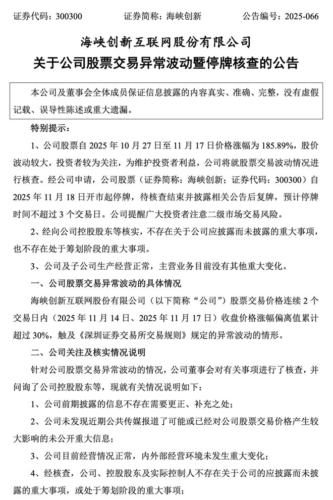 11月17日晚间,海峡创新公告称,公司股票自10月27日至11月17日价格涨幅为185.89%,为维护投资者 利益,公司将就股票交易波动情况进行核查。经公司申请,公司股票自11月18日开市起停牌,待核查结 束并披露相关公告后复牌,预计停牌时间不超过3个交易日。公司目前经营情况正常,内外部经营环境 未发生重大变化,前期披露的信息不存在需要更正、补充之处。 证券简称:海峡创新 公告编号:2025-066 海峡创新互联网股份有限公司 关于公司股票交易异常波动暨停牌核查的公告 本公司及董事会全体成员保证信息披露的内容真实、淮确、完整,没有虚假 记载、误导性陈述或重大遗漏。 特别提示: 1、公司股票自 2025年10月27日至11月17日价格涨幅为 185.89%,股价 波动较大,投资者较为关注,为维护投资者利益,公司将就股票交易波动情况进 行核查。经公司申请,公司股票(证券简称:海峡创新;证券代码:300300)自 2025年11月18日开市起停牌,待核查结束并披露相关公告后复牌,预计停牌 时间不超过3个交易日。公司提醒广大投资者注意二级市场交易风险。 2、经向公司控股股东等核实,不存在关于公司应披露而未披露的重大事 ...