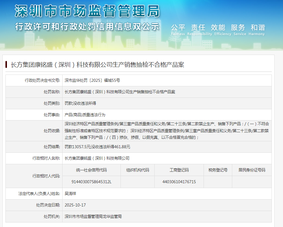 齐鲁晚报·齐鲁壹点记者于深圳市市场监督管理局信用双公示栏获悉,10月17日,ST长方(300301.SZ)旗下的长方集团康铭盛(深圳)科技有限公司(下 称"长方康铭盛")收罚单,处罚事由为产品(商品)质量违法行为,处罚决定书文号:深市监华处罚〔2025〕福城55号。 据长方康铭盛官网介绍,作为拥有自主研发能力的离网照明行业龙头企业,公司立足移动照明产品,持续拓展品类至家居照明、离网生活家电、多功能便携 储能等领域,旗下拥有康铭、KAMISAFE、沃尔风vavofo、多朗达四大品牌。目前,其国内产品零售终端达到50万余家,销售网络覆盖至东南亚、中东、南 美、非洲等100多个国家和地区。 国家企业信用信息公示系统显示,长方集团康铭盛(深圳)科技有限公司成立于2004年,注册资本10747.6万元人民币,法定代表人为吴涛祥,大股东为ST 长方(300301.SZ),持股比例99.8660%。 产经新闻爆料电话:0531—85193242 内容显示,该罚单的处罚名称为:长方康铭盛生产销售抽检不合格产品案。深圳市市场监督管理局龙华监管局依据《深圳经济特区产品质量管理条例》相关 规定,对其罚款13057.5元;没收违法所 ...
