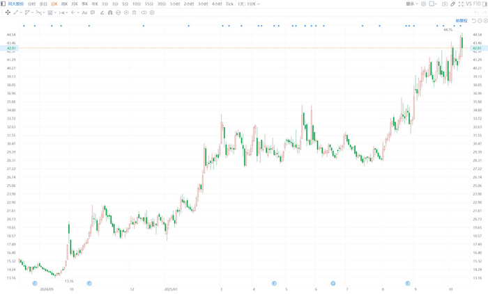同大股份(300321.SZ)今日盘中一度跌5.98%至41.7元,年内股价仍累涨超1倍。同大股份公告,董事徐彦 峰因个人资金需求,计划自公告披露之日起15个交易日后的3个月内,即2025年11月12日至2025年2月11 日期间,通过集中竞价方式减持不超1600股,占0.0018%。减持价格将根据届时市场价格确定,减持数 量遇除权除息事项将相应调整。(格隆汇) ...