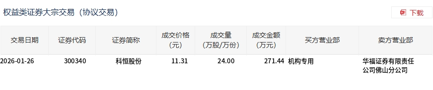 | 交易日期 | 证券代码 | 证券简称 | 成交价格 | 成交量 | 成交金额 | 买方营业部 | 卖方营业部 | | --- | --- | --- | --- | --- | --- | --- | --- | | | | | (元) | (万股/万份) | (万元) | | | | 2026-01-26 | 300340 | 科恒股份 | 11.31 | 24.00 | 271.44 机构专用 | | 华福证券有限责任 | | | | | | | | | 公司佛山分公司 | 1月26日,科恒股份大宗交易成交24万股,成交额271.44万元,占当日总成交额的1.12%,成交价11.31元,较市场收盘价 13.47元折价16.04%。 ...