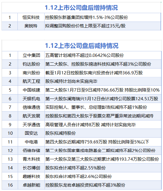 | | | 1.12上市公司盘后减持情况 | | --- | --- | --- | | 1 | 立中集团 | 五高管计划减持不超过0.0642%公司股份 | | 2 | 钧达股份 | 第二大股东、控股股东锦迪科技拟减持不超3%公司股份 | | 3 | 南兴股份 | 截至1月12日控股股东南兴投资合计减持366.9万股 | | র্ব | 航天工程 | 股东减持计划尚未实施完毕 | | ട | 中国核建 | 第二大股东1月7日至9日减持786.66万股 持股比例降至10% | | 6 | 天银机电 | 第一大股东澜海瑞兴1月12日合计减持公司股票124.53万股 | | 7 | 信维通信 | 实际控制人、董事长、总经理彭浩拟减持不超1%股份 | | 8 | 航天发展 | 控股股东和第四大股东于股票交易严重异常波动期间减持 | | 9 | 天孚通信 | 高级管理人员合计减持8万股 减持计划实施完毕 | | 10 | 国安达 | 股东拟减持股份 | | 11 | 中电港 | 第四大股东近期减持759.69万股 持股比例降至5%以下 | | 12 | 佰维存储 | 第二大股东国家集成电路基金二期拟减持不超2%公司股 ...