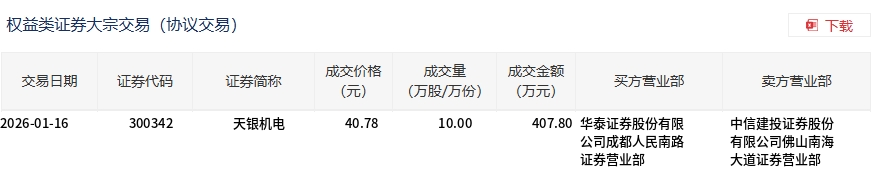 | 交易日期 | 证券代码 | 证券简称 | 成交价格 | 成交量 | 成交金额 | 买方营业部 | 卖方营业部 | | --- | --- | --- | --- | --- | --- | --- | --- | | | | | (元) | (万股/万份) | (万元) | | | | 2026-01-16 | 300342 | 天银机电 | 40.78 | 10.00 | | 407.80 华泰证券股份有限 | 中信建投证券股份 | | | | | | | | 公司成都人民南路 | 有限公司佛山南海 | | | | | | | | 证券营业部 | 大道证券营业部 | 1月16日,天银机电大宗交易成交10万股,成交额407.8万元,占当日总成交额的0.09%,成交价40.78元,较市场收盘价55.49 元折价26.51%。 ...