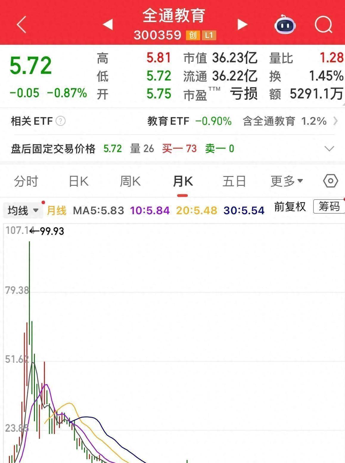 公司股价表现 - 全通教育上市11年,股价从复权后的100元跌至5.72元,累计跌幅达94.28% [1] - 股价在2015年一度冲上825元(未复权),但自2015年6月后开始暴跌,至2018年6月从高点下跌93.5% [1][4][6] - 此后七年多股价在底部震荡,最低探至3.8元,呈现长期阴跌态势 [8] 公司财务与经营状况 - 公司近两年年报及季报均为亏损状态,最新三季报营收仅为2亿元 [11] - 根据规则,若全年营收低于3亿元,公司明年将被标记为ST [11] - 上市11年每股累计分红仅0.58元,最近七年未进行分红 [14] 市场交易与股东情况 - 当前股价为5.72元,市值36.23亿元,市盈率为亏损状态 [3][12] - 股东户数稳定在3.38万户,近两年变化不大,显示有投资者持续尝试抄底 [1][11] 历史背景与市场行为 - 公司上市初期曾利用“高送转”概念吸引散户,如进行10送16、10送12等操作 [1] - 股价暴跌后,在50元、20元、10元等不同价位均有投资者尝试抄底,但均被套牢 [11] - 该案例被视为高送转炒作泡沫破裂及无业绩支撑股票风险的典型代表 [15]