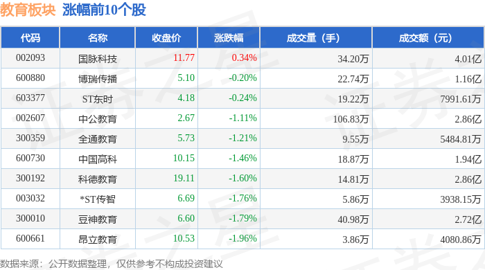 | 代码 | 名称 | 收盘价 | 涨跌幅 | 成交量(手) | 成交额(元) | | --- | --- | --- | --- | --- | --- | | 002093 | 国脉科技 | 11.77 | 0.34% | 34.20万 | 4.01亿 | | 600880 | 博瑞传播 | 5.10 | -0.20% | 22.74万 | 1.16亿 | | 603377 | ST东时 | 4.18 | -0.24% | 19.22万 | 7991.61万 | | 002607 | 中公教育 | 2.67 | -1.11% | 106.83万 | 2.86亿 | | 300359 | 全通教育 | 5.73 | -1.21% | 9.55万 | 5484.81万 | | 600730 | 中国高科 | 10.15 | -1.46% | 18.87万 | 1.94亿 | | 300192 | 科德教育 | 19.11 | -1.60% | 14.81万 | 2.86亿 | | 003032 | *ST传智 | 6.69 | -1.76% | 5.86万 | 3938.15万 | | 300010 | 豆神 ...