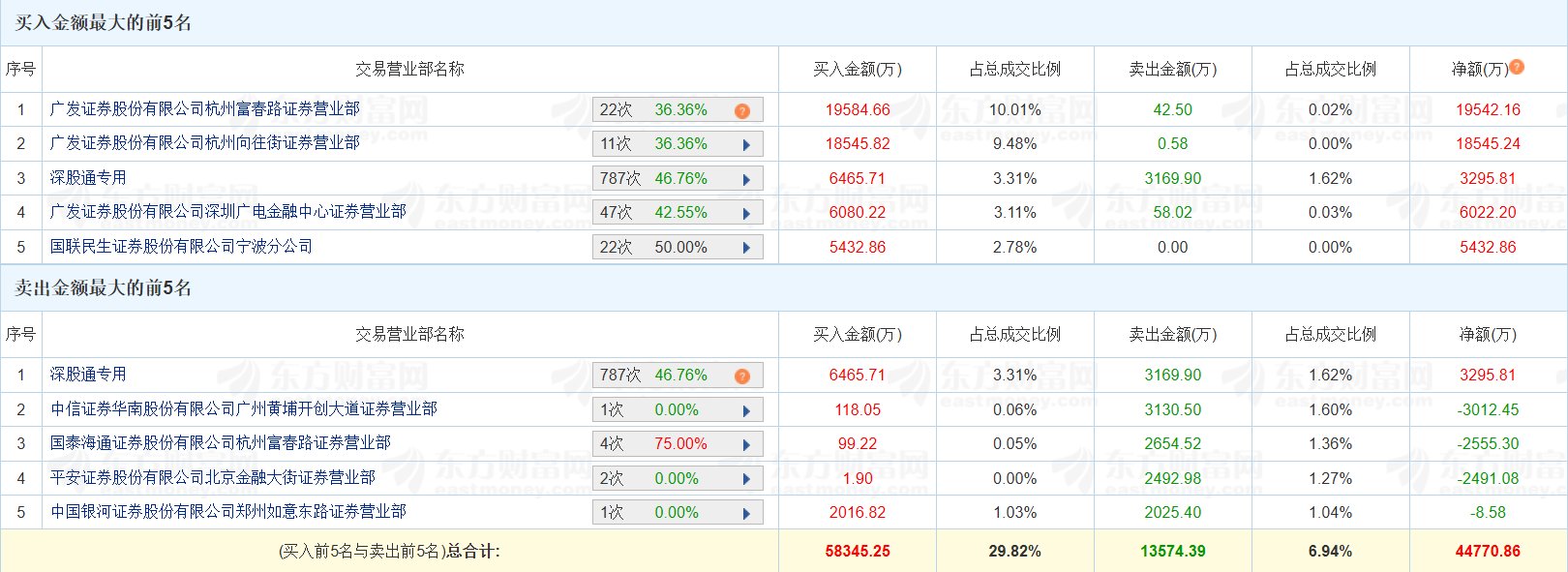 格隆汇11月11日|炬华科技(300360.SZ)今日20CM涨停,换手率20.19%,成交额19.56亿元。龙虎榜数据显示,深股通买净买入3296万元;广发证券杭州富春 路证券营业部位列买一席位,净买入1.95亿元;广发证券杭州向往街证券营业部位列买二席位,净买入1.85亿元。上榜席位全天买入5.83亿元,卖出1.36亿 元,合计净买入4.48亿元。(格隆汇) | 序号 | 交易营业部名称 | | | | 买入金额(万) | 占总成交比例 | | --- | --- | --- | --- | --- | --- | --- | | 1 | 广发证券股份有限公司杭州富春路证券营业部 | 22次 | 36.36% | 2 | 19584.66 | 10.01% | | 2 | 广发证券股份有限公司杭州向在街证券营业部 | 11次 | 36.36% | A | 18545.82 | 9.48% | | 3 | 深版通专用 | | 787次 46.76% | A | 6465.71 | 3.31% | | 4 | 广发证券股份有限公司深圳广电金融中心证券营业部 | 47次 | 42.55% | ▲ | 6080. ...