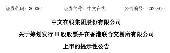 来源:新浪港股-好仓工作室 声明:市场有风险,投资需谨慎。 本文为AI大模型基于第三方数据库自动发布,任何在本文出现的信 息(包括但不限于个股、评论、预测、图表、指标、理论、任何形式的表述等)均只作为参考,不构成 个人投资建议。受限于第三方数据库质量等问题,我们无法对数据的真实性及完整性进行分辨或核验, 因此本文内容可能出现不准确、不完整、误导性的内容或信息,具体以公司公告为准。如有疑问,请联 系biz@staff.sina.com.cn。 点击查看公告原文>> 中文在线集团股份有限公司(证券代码:300364)于2025年12月15日发布公告称,公司当日召开第六届 董事会第五次会议,审议通过了《关于公司发行H股股票并在香港联合交易所有限公司主板上市的议 案》等相关议案,本次发行上市方案尚需提交公司股东会审议,且将在股东会决议有效期(即通过之日 起24个月内)选择适当时机完成;公司表示,此次赴港上市旨在进一步推进全球化战略布局、提升综合 竞争力,目前正积极与相关中介机构就本次发行上市的具体工作进行商讨,但发行股份比例等具体细节 尚未最终确定,后续还需取得中国证券监督管理委员会、香港联合交易所有限公司及香港证券 ...