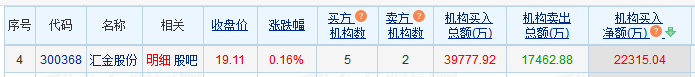 中国经济网北京9月30日讯 今日,汇金股份(300368.SZ)收报19.11元,涨幅0.16%。 | 序号 | 交易营业部名称 | | 买入金额(万) | 占总成交比例 | 卖出金额(万) | 占总成交比例 | | --- | --- | --- | --- | --- | --- | --- | | | 国泰海通证券股份有限公司威宁咸宁大道证券营业部 | 38次 39.47% 2 | 0.19 | 0.00% | 6298.54 | 1.78% | | വ | eastmoney.com 机构专用 | 1745次 41.72% | 11398.49 | 3.22% | 5198.74 | 1.47% | | ന | 机构专用 | 1745次 41.72% | 8603.51 | 2.43% | 5033.44 | 1.42% | | ব | 东北证券股份有限公司佛山分公司 | 11次 45.45% eastmone | 32.51 | 0.01% | 4144.75 | 1.17% | | 5 | 东方证券股份有限公司张家港东环路证券营业部 | 17次 29.41% | 0.00 | 0.00% | 38 ...