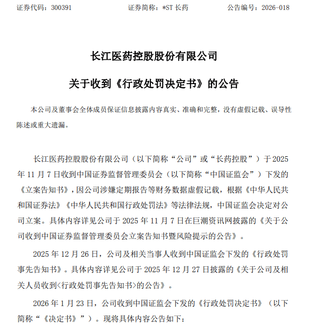 公司收到行政处罚决定 - 2026年1月24日,长江医药控股股份有限公司(长药控股、*ST长药,代码300391)发布公告,称收到中国证监会的行政处罚决定书 [1][6] 财务造假事实与细节 - 2020年11月,公司通过支付现金方式收购湖北长江星医药股份有限公司52.75%的股权,并于同年12月将其纳入合并报表范围 [2][7] - 2021年至2023年,长江星的两家子公司通过制作虚假的入库单、出库单,在无真实销售业务的情况下确认收入,导致公司年度报告存在虚假记载 [2][7] - 2021年虚增营业收入21,532.38万元,占当期披露营业收入的9.12%;虚增利润总额5,640.14万元,占当期披露利润总额绝对值的35.62% [2][7] - 2022年虚增营业收入28,373.66万元,占当期披露营业收入的17.57%;虚增利润总额6,337.52万元,占当期披露利润总额绝对值的88.23% [2][7] - 2023年虚增营业收入23,363.46万元,占当期披露营业收入的19.51%;虚增利润总额4,370.50万元,占当期披露利润总额绝对值的6.42% [2][7] - 此外,2022年因未合理确认长江伟创中药城交易中心工程项目损失,导致当年虚增利润总额455.24万元,占当期披露利润总额的6.34% [2][7] - 中国证监会决定对公司及相关责任人员责令改正,给予警告,并各处罚款 [2][7] 可能面临的退市风险 - 公司表示,可能触及《深圳证券交易所创业板股票上市规则》中关于“年度报告财务指标连续三年存在虚假记载”的重大违法强制退市情形,股票可能被实施重大违法强制退市 [3][8][9] 事件时间线与法律背景 - 2025年11月7日,公司因涉嫌定期报告等财务数据虚假记载被中国证监会立案 [3][9] - 2025年12月27日,公司及相关人员收到行政处罚事先告知书 [3][9] - 根据相关法律,因虚假陈述导致投资者权益受损的,责任方应承担民事赔偿责任,赔偿范围包括投资差额、佣金、印花税等 [3][9] 投资者索赔信息 - 上海汉联律师事务所宋一欣律师向受损投资者展开诉讼代理征集 [4][9] - 初步提出的索赔条件为:在2022年4月28日至2025年11月6日期间买入长药控股股票或债券等产品,并在2025年11月7日及之后卖出或继续持有的受损投资者 [4][9]