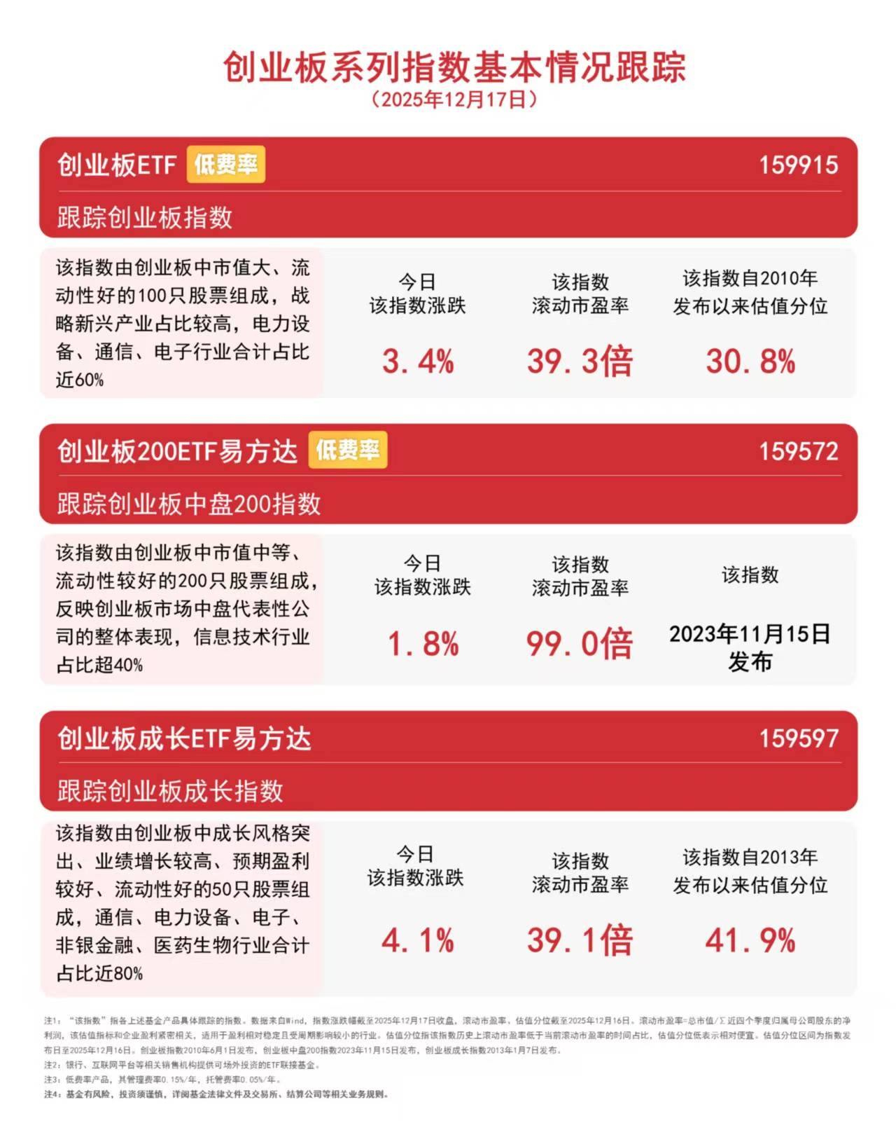 市场午后反弹,CPO概念股领涨。截至收盘,新易盛、天孚通信涨超9%,中际旭创涨超6%。指数方面,创业板成长指数上涨4.1%,创业板指数上涨3.4%, 创业板中盘200指数上涨1.8%。Wind数据显示,截至昨日,创业板ETF(159915)连续3个交易日获资金布局,合计净流入约17亿元。 | 创业板ETF 低费率 | | | | | --- | --- | --- | --- | | 跟踪创业板指数 | | | | | 该指数由创业板中市值大、流 | ▽日 | 该指数 | 该指数自2 | | 动性好的100只股票组成,战 | 该指数涨跌 | 滚动市盈率 | 发布以来估 | | 略新兴产业占比较高,电力设 | | | | | 备、通信、电子行业合计占比 | 3.4% | 39.3倍 | 30. 8 | | 近60% | | | | | 创业板200ETF易方达 低费率 | | | | | 跟踪创业板中盘200指数 | | | | | 该指数由创业板中市值中等、 | 令日 | 该指数 | 该指 | | 流动性较好的200只股票组成, | 该指数涨跌 | 滚动市盈率 | | | 反映创业板市场中盘代表性公 | | ...