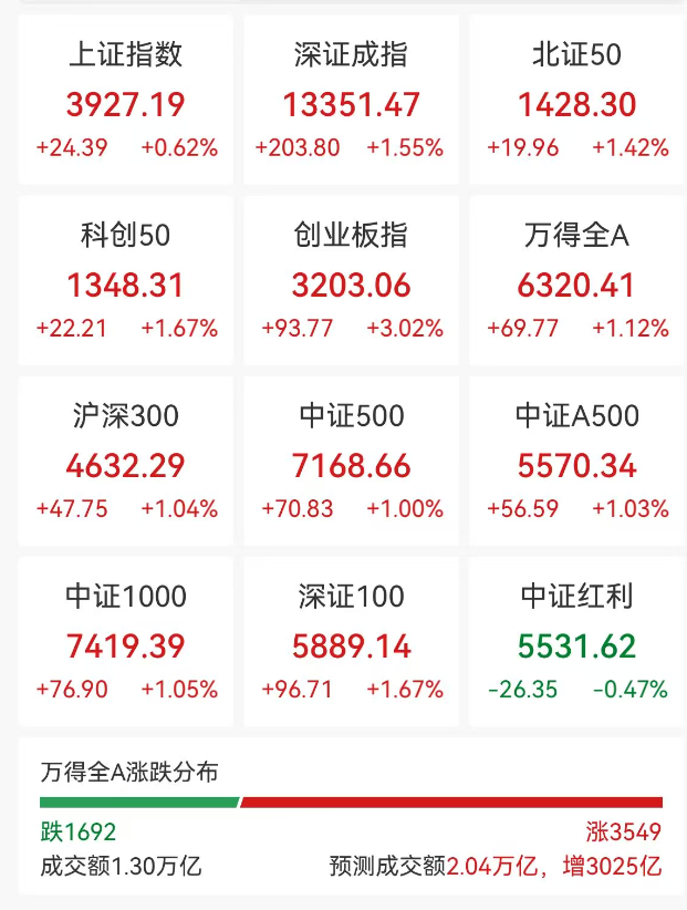 记者丨黎雨桐 编辑丨金珊 12月8日,A股市场早盘震荡反弹,截至早盘收盘,沪指涨0.62%,深成指涨1.55%,创业板指涨3.02%。沪深两市半日成交额1.30万亿,较上个 交易日放量3025亿。全市场超3500只个股上涨。 | 上证指数 | 深证成指 | 北证50 | | --- | --- | --- | | 3927.19 | 13351.47 | 1428.30 | | +24.39 +0.62% +203.80 +1.55% +19.96 +1.42% | | | | 科别20 | 创业板指 | 万得全A | | 1348.31 | 3203.06 | 6320.41 | | +22.21 +1.67% +93.77 +3.02% | | +69.77 +1.12% | | 沪深300 | 中证500 | 中证A500 | | 4632.29 | 7168.66 | 5570.34 | | +47.75 +1.04% +70.83 +1.00% +56.59 +1.03% | | | | 中证1000 | 深证100 | 中证红利 | | 7419.39 | 5889.14 | 5531.62 | ...