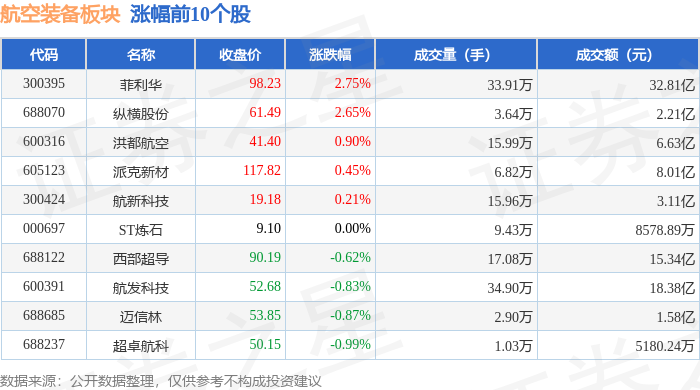 证券之星消息,1月28日航空装备板块较上一交易日下跌1.72%,*ST观典领跌。当日上证指数报收于 4151.24,上涨0.27%。深证成指报收于14342.9,上涨0.09%。航空装备板块个股涨跌见下表: | 代码 | 名称 | 收盘价 | 涨跌幅 | 成交量(手) | 成交额(元) | | --- | --- | --- | --- | --- | --- | | 300395 | 菲利华 | 98.23 | 2.75% | 33.91万 | 32.81亿 | | 688070 | 纵横股份 | 61.49 | 2.65% | 3.64万 | 2.21亿 | | 600316 | 洪都航空 | 41.40 | 0.90% | 15.99万 | 6.63亿 | | 605123 | 派克新材 | 117.82 | 0.45% | 6.82万 | 8.01亿 | | 300424 | 航新科技 | 19.18 | 0.21% | 15.96万 | 3.11亿 | | 000697 | ST炼石 | 9.10 | 0.00% | 9.43万 | 8578.89万 | | 688122 | 西部超导 | 90.1 ...