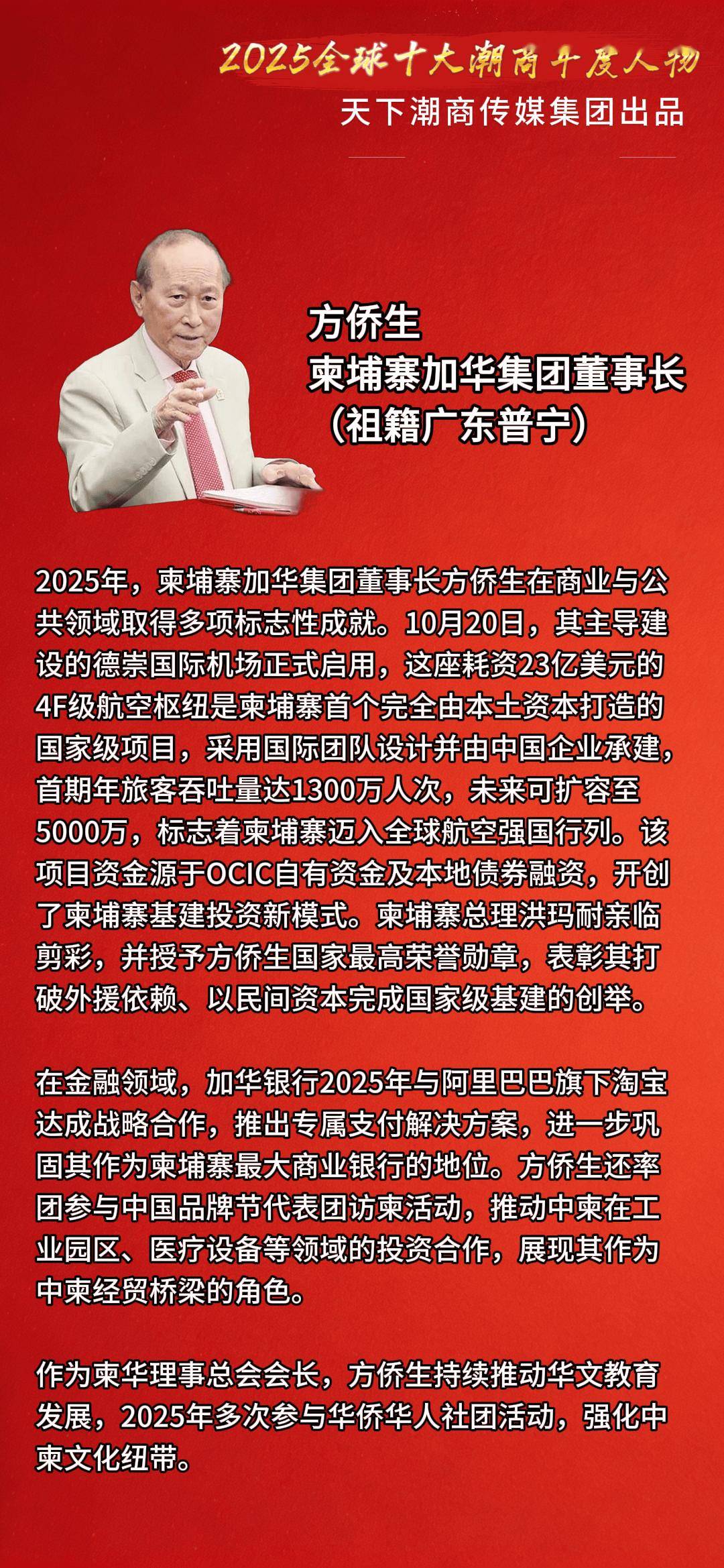 在2025年的商业浪潮中,一群出类拔萃的潮商精英凭借超凡的商业韬略与非凡的领袖风范,成为推动全球潮商事业蓬勃发展的中坚力量。今日,天下潮商 传媒盛大揭晓"2025十大潮商年度人物"榜单,透过这份承载着商业荣耀与时代担当的榜单,我们不仅见证了他们开拓创新的商业成就,更感受到他们以家 国情怀为底色、以责任担当为脊梁的精神品格。他们以敢为人先的魄力与久久为功的坚守,在时代画卷上镌刻下属于潮商群体的璀璨印记,为全球商业文 明注入生生不息的潮商力量。 破外援依赖、以民间资本完成国家级基建的创举。 在金融领域,加华银行2025年与阿里巴巴旗下淘宝 达成战略合作,推出专属支付解决方案,进一步巩 国其作为柬埔寨最大商业银行的地位。方侨生逐容 团参与中国品牌节代表团访柬活动,推动中柬在工 业园区、医疗设备等领域的投资合作,展现其作为 中柬经贸桥梁的角色。 作为柬华理事总会会长。方侨生持续推动华文教育 发展,2025年多次参与华侨华人社团活动,强化中 柬文化纽带。 2025会球十大潮雨于度人物 天下潮商传媒集团出品 s 湖東团创始人 重量高端 (祖籍广东揭东) 2025年,玉湖集团董事长黄向墨在冷链物流领域持续 发力,商业颍图库 ...
