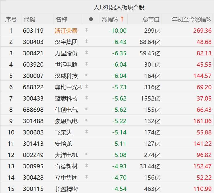 A股异动丨人形机器人概念股集体下挫,浙江荣泰跌停