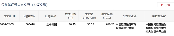 交易概况 - 2026年2月5日,立中集团发生一笔大宗交易,成交量为30.28万股,成交金额为619.23万元,占该股当日总成交额的2.7% [1] - 该笔大宗交易的成交价格为20.45元,较当日市场收盘价22.5元折价9.11% [1] 交易细节 - 交易证券为立中集团,证券代码为300428 [2] - 买方营业部为中信证券股份有限公司湖南分公司 [2] - 卖方营业部为中国银河证券股份有限公司北京中关村大街证券营业部 [2]