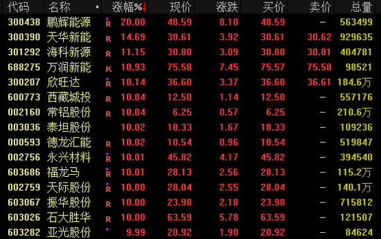10月29日晚,鹏辉能源发布2025年第三季度报告。第三季度公司实现营业收入32.8亿元,同比增长74.96%;实现净利润2.03亿元,同比增长977.24%。 鹏辉能源总裁甄少强日前接受中国证券报记者采访时表示,公司坚持电池核心技术创新,通过技术差异化和全球化深度运营,坚定从"量"的市场扩张转 向"质"的价值创造,推动公司业绩持续稳健增长。 同花顺数据显示,10月30日,鹏辉能源开盘后直线拉升,收获"20CM"涨停,股价收盘报48.59元/股,最新市值为244.57亿元。 | 鹏辉能源 | | | | | | | --- | --- | --- | --- | --- | --- | | 300438 融 L1 深股通 | | | | | | | 48.59 48.59 | 高 | | | 市值 244.57亿 量比 1.30 | | | 8.10 20.00% | 低 | 45.50 | 流通 196.38亿 | 换 13.94% | | | 15:01:41 (1) 45.50 | チ | | 市盈™ 亏损 | 27.06亿 额 | | | 相关ETF (2 | | | 储能电池ETF广发 -0.41% ...