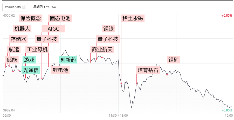 A股今日(10月30日)午后回落走低,沪指再度失守4000点大关,创业板指、科创50指数跌近2%;港股午后亦跳水,但尾盘探底回升,恒生指 数一度翻红,恒生科技指数跌幅有所收窄。 具体来看,A股主要股指盘中震荡下探,截至收盘,沪指跌0.73%报3986.9点,深证成指跌1.16%报13532.13点,创业板指跌1.84%报3263.02点,科创50指 数跌1.87%,沪深北三市合计成交24646亿元,较此前一日增加1737亿元。 场内超4000股飘绿,煤炭板块大幅走低,开滦股份、安泰集团盘中跌停;券商板块走弱,中金公司、东方财富等跌超3%;AI产业链股跳水,腾景科技、天孚 通信等跌超10%;创新药概念亦下挫,翰宇药业跌超10%,药明康德跌超8%;钢铁、有色板块拉升,常铝股份、大中矿业两连板,安阳钢铁等涨停;锂电概 念逆市爆发,鹏辉能源、石大胜华、天齐锂业等均涨停;量子科技概念再度活跃,国盾量子(688027)盘中一度涨停股价突破600元大关,续创新高。 港股方面,赣锋锂业涨约15%,中国铝业、天齐锂业涨超9%,中国宏桥涨逾8%。 锂电产业链股爆发 A股锂电产业链股盘中强势拉升,截至收盘,鹏辉能源20%涨停,天华 ...