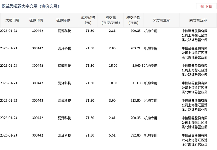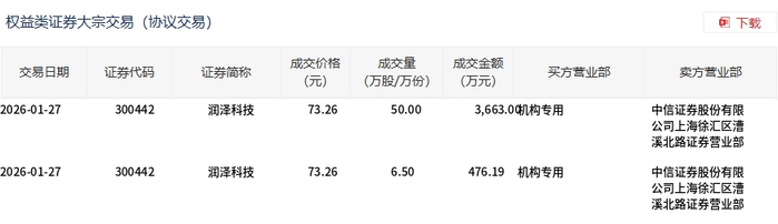 | 交易日期 | 证券代码 | 证券简称 | 成交价格 (元) | 成交量 | 成交金额 (万元) | 买方营业部 | 卖方营业部 | | --- | --- | --- | --- | --- | --- | --- | --- | | | | | | (万股/万份) | | | | | 2026-01-27 | 300442 | 润泽科技 | 73.26 | 50.00 | 3,663.0 机构专用 | | 中信证券股份有限 | | | | | | | | | 公司上海徐汇区清 | | | | | | | | | 溪北路证券营业部 | | 2026-01-27 | 300442 | 润泽科技 | 73.26 | 6.50 | 476.19 机构专用 | | 中信证券股份有限 | | | | | | | | | 公司上海徐汇区清 | | | | | | | | | 溪北路证券营业部 | 1月27日,润泽科技大宗交易成交56.5万股,成交额4139.19万元,占当日总成交额的0.71%,成交价 73.26元,较市场收盘价81.37元折价9.97%。 ...