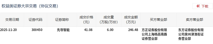 大宗交易概况 - 2025年11月20日,先导智能发生一笔大宗交易,成交量为6万股,成交金额为246.48万元,占当日总成交额的0.1% [1] - 该笔大宗交易的成交价格为41.08元,较当日市场收盘价50.1元折价18% [1] 交易细节 - 交易证券代码为300450,证券简称为先导智能 [2] - 买方营业部为方正证券股份有限公司上海杨高南路证券营业部 [2] - 卖方营业部为东方证券股份有限公司泉州津准街证券营业部 [2]